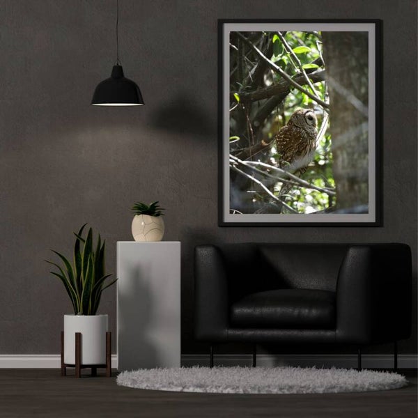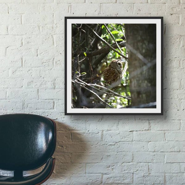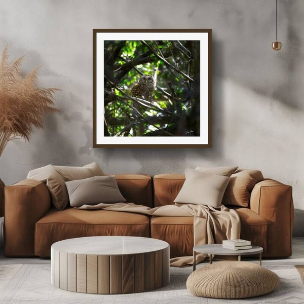 This striking piece reveals an owl nestled among the branches, showcasing its remarkable camouflage. The intricate details of the owl's feathers blend seamlessly with the surrounding foliage, creating a moment of quiet observation in nature. The play of light and shadow adds depth, inviting viewers to appreciate the subtle beauty of wildlife. Perfect for those who cherish the tranquility of the outdoors, this artwork makes a thoughtful addition to any space.